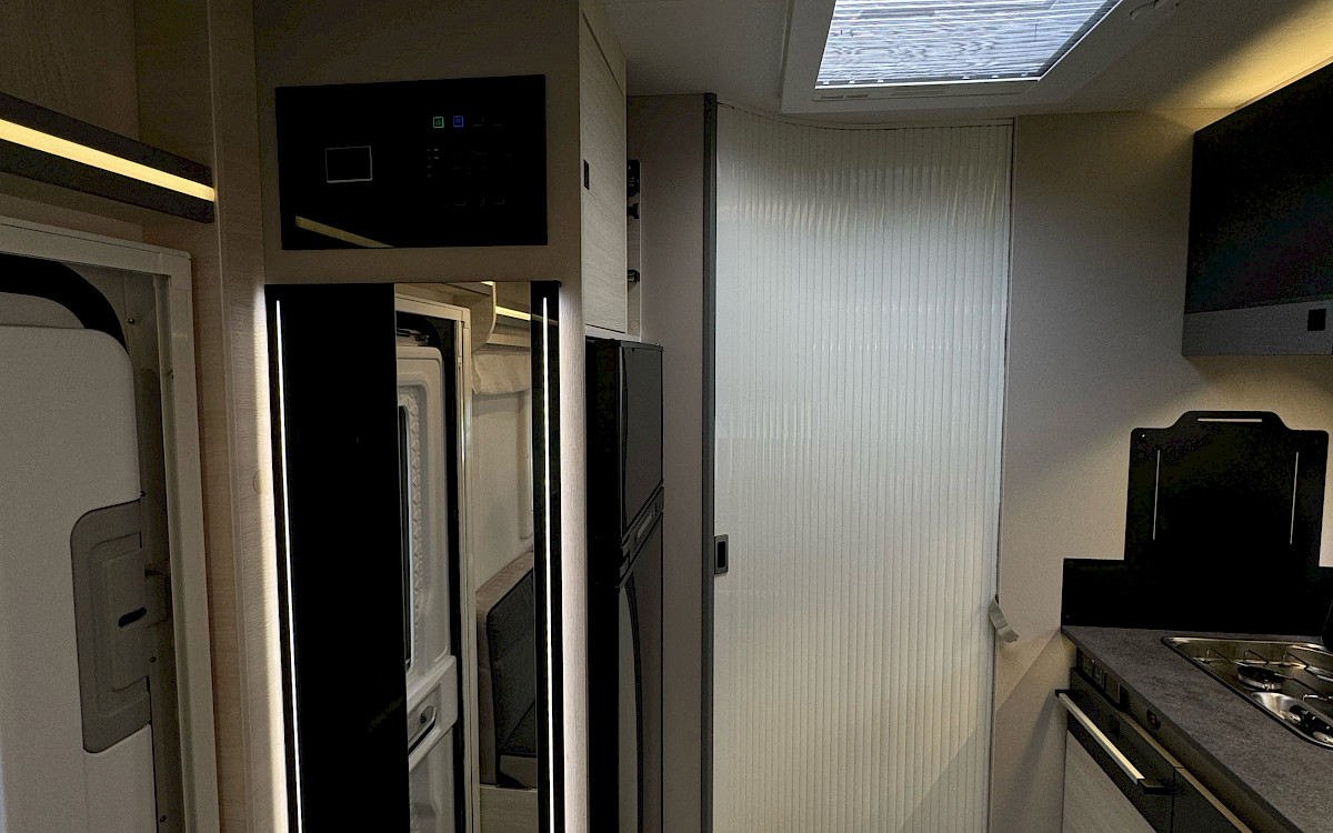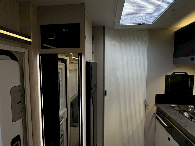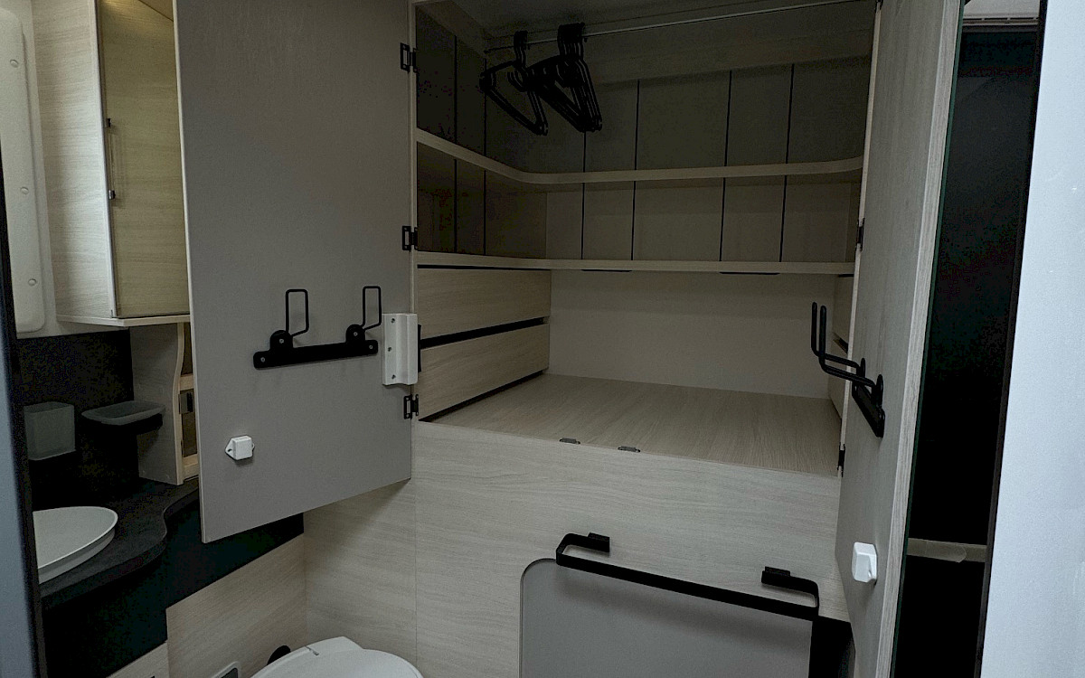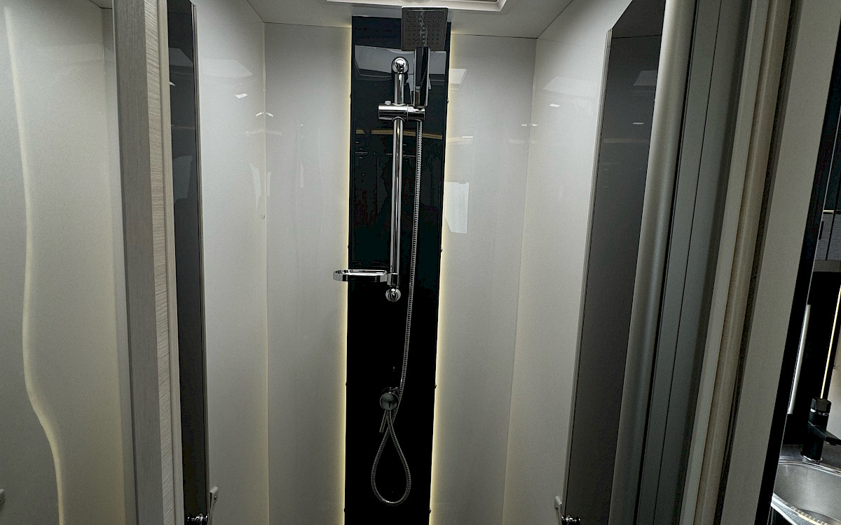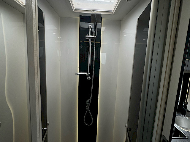 Uiteraard is de Titanium Ultimate 640 uitgerust met alle sanitaire voorzieningen. De bijzonder ruime badkamer bevat een luxe, volledig afsluitbare, douchecabine, een praktische wastafel met spiegel en een cassette toilet. Achter de spiegeldeuren in de badkamer bevindt zich een gigantische kast om al uw kleding op te bergen. Uw overige bagage bergt u op in de ruime berging, welke vanuit beide zijkanten te bereiken is en uitermate geschikt is voor onder andere uw fietsen, stoelen, tafel en bagage.