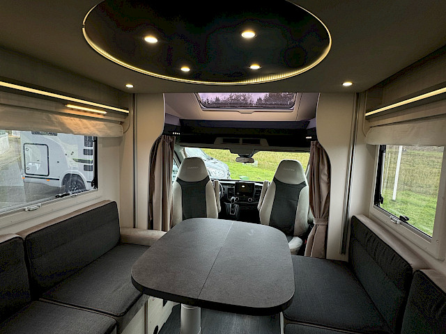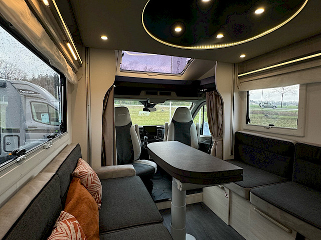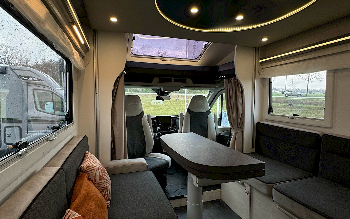 De Chausson 640 is van binnen zeer ruim, maar toch compact op de weg door zijn lengte en breedte van 6.99m x 2.35m. Als u de camper binnenstapt, ervaart u direct de ruimte en de luxe door de Smart Lounge, welke beschikt over twee tegenover elkaar staande banken die eenvoudig kunnen worden getransformeerd in comfortabele zetels met gordel. Door het scharnierende en elektrisch verstelbare tafelblad combineert de leefruimte een eenvoudige doorgang met een praktische zit.