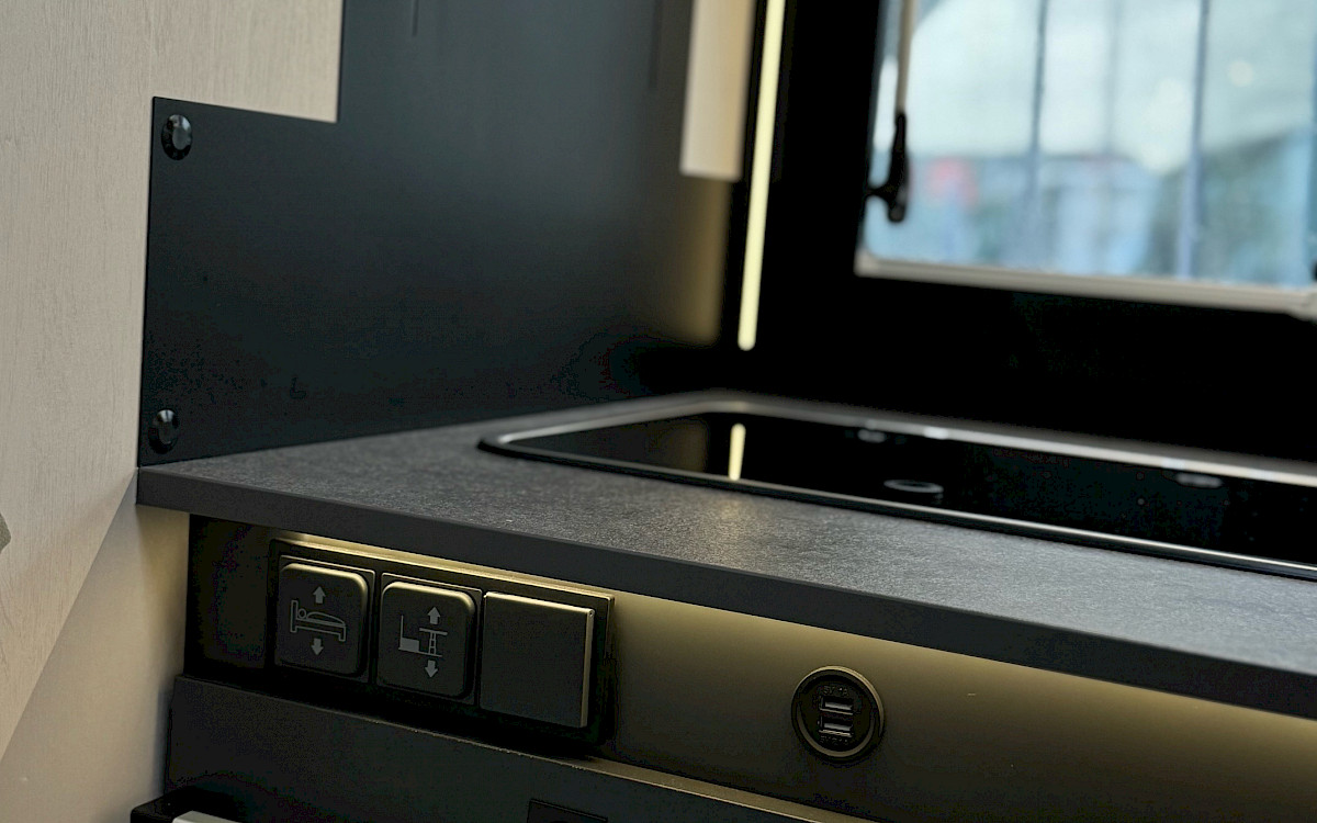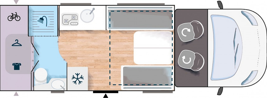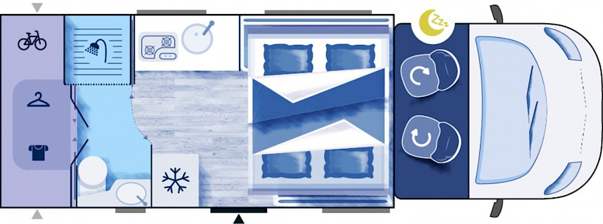 Slapen doet u in het zeer praktische en ruime paviljoen-bed dat zich boven het woongedeelte laat zakken. Met een afmeting van 190 x 160cm heeft u ook op vakantie de ruimte in bed die u van thuis gewend bent. Laat u het bed niet volledig tot instaphoogte zakken, dan kunnen er zelfs 4 slaapplaatsen gecreëerd worden door de dinette om te bouwen tot bed (195 x 125cm).