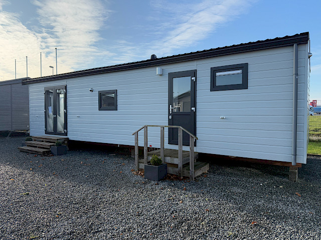 Op bovenstaade afbeeldingen wordt het volgende model getoond: 1100 x 400 - 2 slaapkamers met toegepaste opties: gordijnen, vaatwasser, antraciet kozijnen, antraciet goot en regenpijpen en een antractie boei.