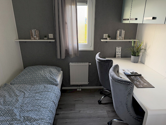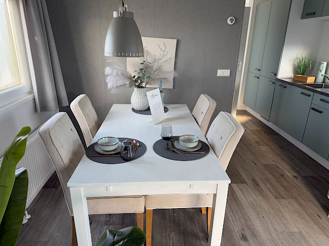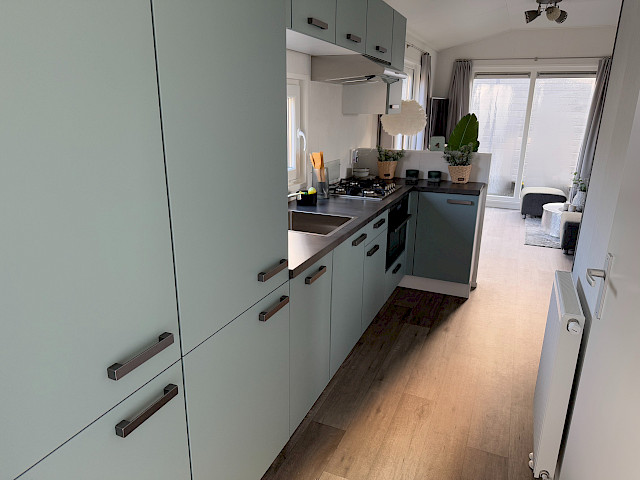 De Bergjes Everest is net even anders dan de standaard modellen doordat zijn raampartij uit het midden geplaatst is. De ruimtelijkheid in de woonkamer en de frisse look en feel gaan gepaard met veel luxe details in de keuken; denk aan een geïntegreerde vaatwasser, een luxe kooktoestel met oven/grill, en een klein barretje. De mooie accent wanden in het chalet maken hem helemaal af!