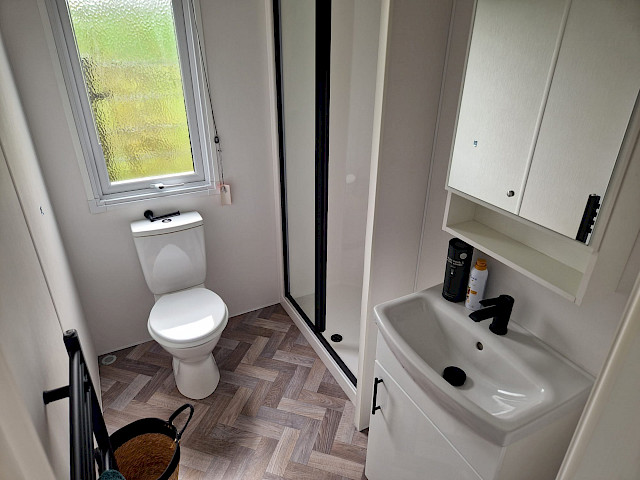 De Ocean stacaravan biedt alles wat u nodig heeft voor een comfortabel verblijf. De grote ramen en terrasdeuren zorgen voor een overvloed aan natuurlijk licht en een naadloze overgang naar buiten. De stijlvolle vinyl vloerbekleding in visgraatmotief geeft een moderne en warme uitstraling. De L-vormige keuken met elegante zwarte accenten is voorzien van een 4-pits fornuis en een ingebouwde koel/vries combinatie. Verder biedt de Ocean twee slaapkamers met voldoende opbergruimte en een badkamer met een ruime douchecabine en een toilet.