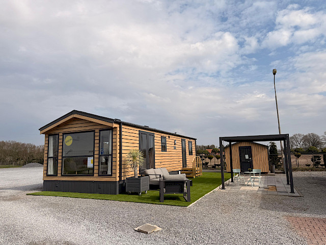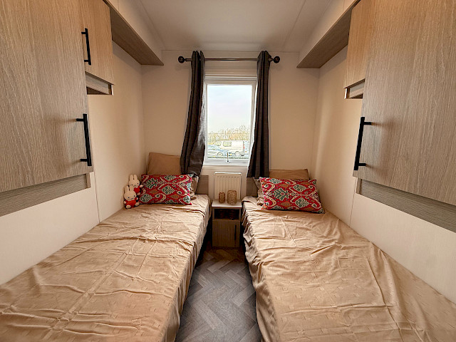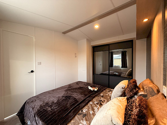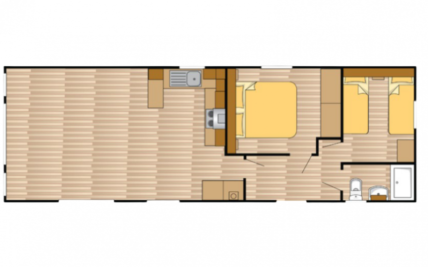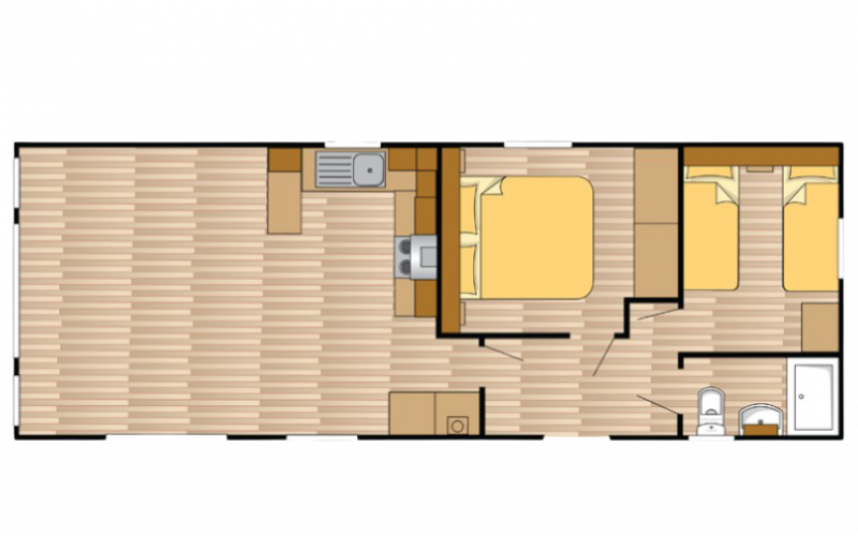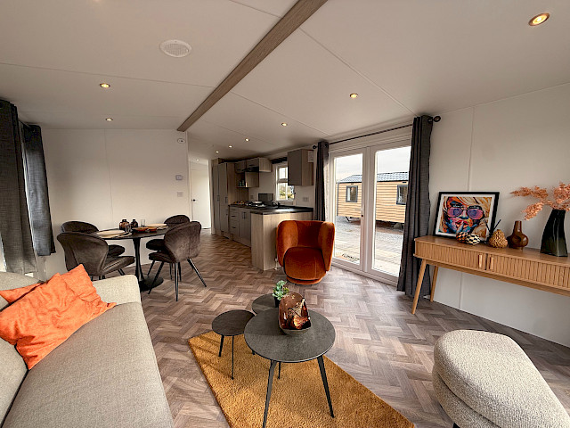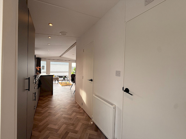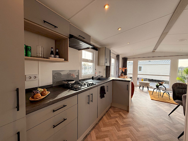 De Ocean stacaravan biedt alles wat u nodig heeft voor een comfortabel verblijf. De grote ramen en terrasdeuren zorgen voor een overvloed aan natuurlijk licht en een naadloze overgang naar buiten. De stijlvolle vinyl vloerbekleding in visgraatmotief geeft een moderne en warme uitstraling. De L-vormige keuken met elegante zwarte accenten is voorzien van een 4-pits fornuis en een ingebouwde koel/vries combinatie. Verder biedt de Ocean twee slaapkamers met voldoende opbergruimte en een badkamer met een ruime douchecabine en een toilet.