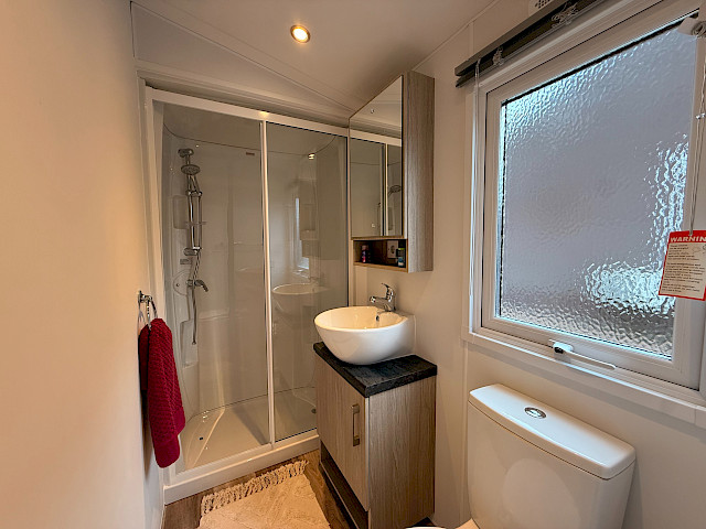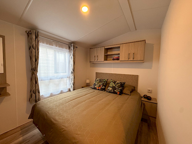 Op bovenstaande afbeeldingen wordt het volgende model getoond: 890 x 370 - 2 slaapkamers. Met toegepaste opties: andere kleur buitengevel, andere kleur kozijnen, extra stopcontact in de badkamer en een luxe badmeubel.