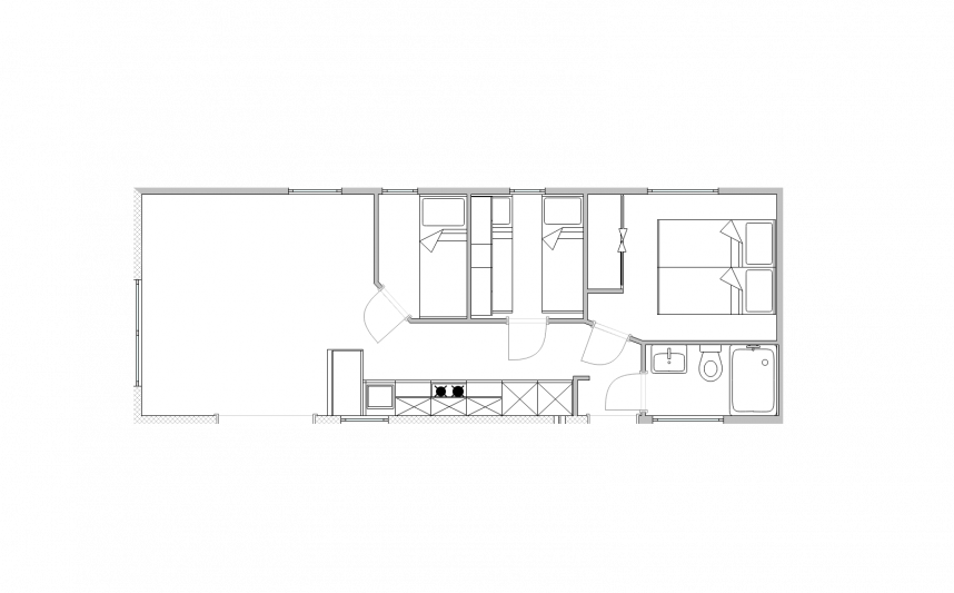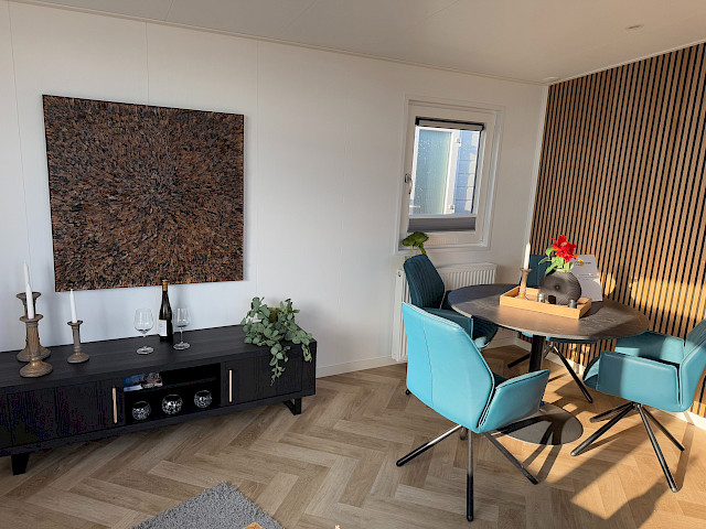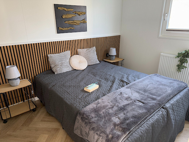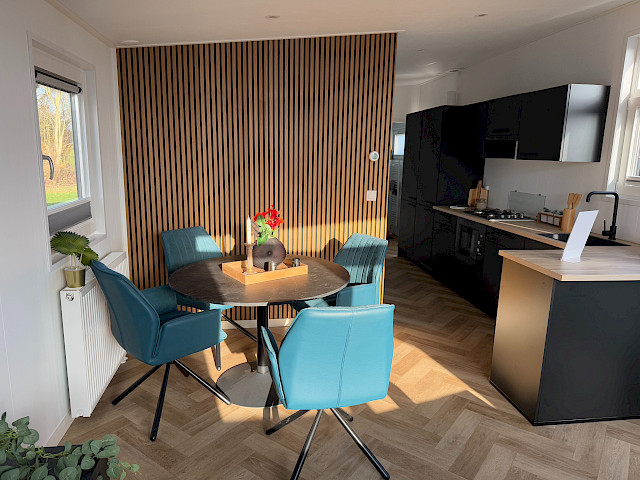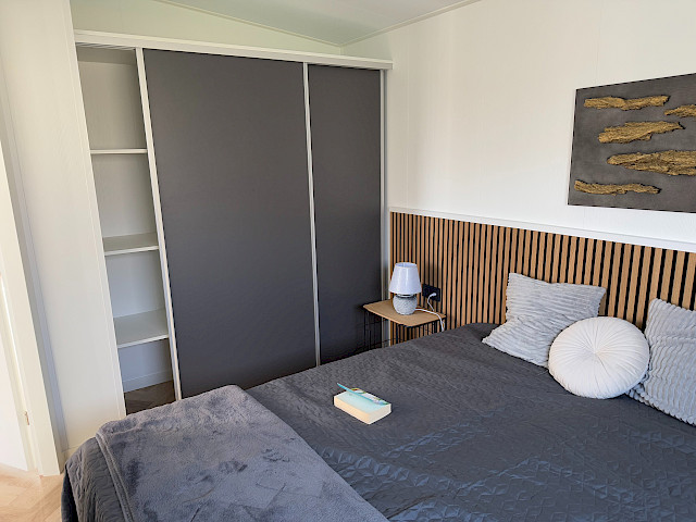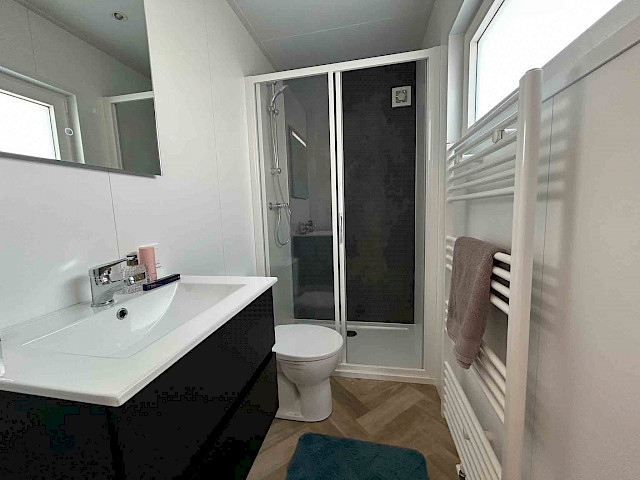 De Volente Deluxe biedt alles wat u nodig heeft voor een comfortabel verblijf. De ruime woonkamer is voorzien van een vinylvloer, grote terrasdeuren en een TV-aansluiting. De L-vormige keuken is van alle gemakken voorzien, met veel opbergruimte, een 4-pits kookplaat, afzuigkap en een ingebouwde koel-/vrieskast. De master slaapkamer biedt een tweepersoonsbed en een ruime kledingkast met schuifdeuren. De logeer-/kinderkamer heeft twee eenpersoonsbedden en handige hangkastjes voor extra opbergruimte. In de moderne badkamer vindt u een stijlvol badmeubel, een design radiator, een toilet en een ruime douchecabine met een tegelmotief op de wand. De chalet is afgewerkt met kunststof buitenbekleding in houtlook, kunststof kozijnen, dubbel glas en centrale verwarming - een perfecte balans tussen comfort en duurzaamheid.