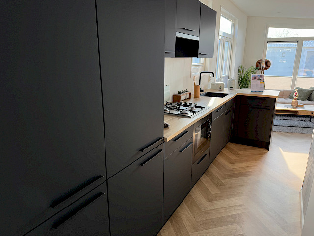 Op bovenstaande afbeeldingen wordt volgend model getoond: 1100 x 400 - 2 slaapkamers. Met toegepaste opties: Antraciete regenpijpen, boeideel in kleur, kozijnen in kleur, hangend toilet, wandbekleding silentlines, buiten stopcontact apart geschakeld, vaatwasmaschine, zwarte spoelbak en kraan, keuken prijsgroep 2 muizenrooster en een pliseepakket. Met een totaal prijs van: €90.486,-