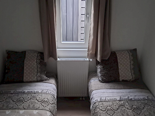 Op bovenstaande afbeeldingen wordt volgend model getoond: 1100 x 400 - 2 slaapkamers, met toegepaste optie: vaatwasmachine, combi oven, bovenkasten in de kleine slaapkamer, boxspringbedden, en een gordijnenpakket. Met een totaal prijs van: €68.670,-