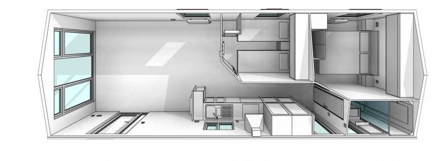 Op bovenstaande afbeeldingen wordt volgend model getoond: 1000 x 370 - 2 slaapkamers. Met toegepaste optie een vaatwasser.