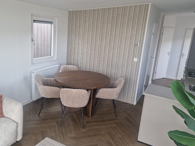De Volente Deluxe biedt alles wat u nodig heeft voor een comfortabel verblijf. De ruime woonkamer is voorzien van een vinylvloer, grote terrasdeuren en een TV-aansluiting. De L-vormige keuken is van alle gemakken voorzien, met veel opbergruimte, een 4-pits kookplaat, afzuigkap en een ingebouwde koel-/vrieskast. De master slaapkamer biedt een tweepersoonsbed en een ruime kledingkast met schuifdeuren. De logeer-/kinderkamer heeft twee eenpersoonsbedden en handige hangkastjes voor extra opbergruimte. In de moderne badkamer vindt u een stijlvol badmeubel, een design radiator, een toilet en een ruime douchecabine met een tegelmotief op de wand. De chalet is afgewerkt met kunststof buitenbekleding in houtlook, kunststof kozijnen, dubbel glas en centrale verwarming - een perfecte balans tussen comfort en duurzaamheid.