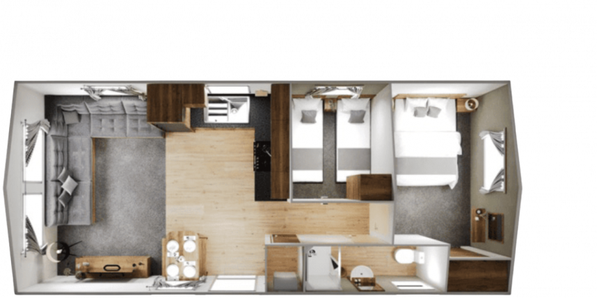 De Ellerton is zorgvuldig ontworpen om de beschikbare vloeroppervlakte optimaal te benutten, zodat er genoeg plek is voor het hele gezin. De praktische keuken in L-vorm biedt volop ruimte om samen te koken, terwijl de open leefruimte ervoor zorgt dat je altijd in contact blijft met je familie of vrienden. De slaapkamers bieden alles wat je nodig hebt: een comfortabel bed, en genoeg opbergruimte voor kleding en persoonlijke spullen.