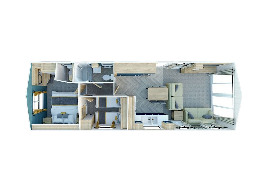 Op bovenstestaande afbeelding wordt het volgende model getoond: 1200 x 370 - 2 slaapkamers. Met toegepaste opties een vaatwasser.