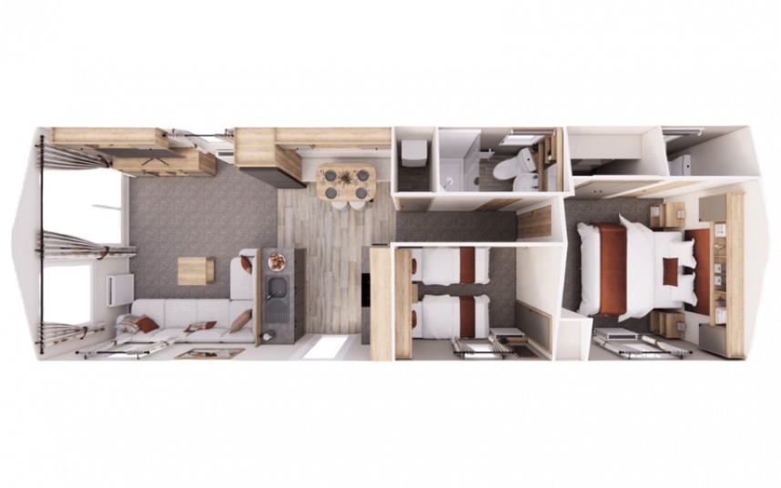 De Willerby Rio is een moderne en sfeervolle stacaravan die comfort en gebruiksgemak perfect combineert. Dankzij de slimme indeling voelt de ruimte open en gezellig aan, met een lichte woonkamer, royale hoekbank en grote ramen die veel daglicht binnenlaten. De keuken is praktisch ingericht met moderne apparatuur en biedt voldoende opbergruimte, terwijl de eethoek ideaal is voor gezellige momenten met familie of vrienden. In de twee slaapkamers geniet je van rust en comfort, met een ruime master bedroom voorzien van veel kastruimte en een tweede slaapkamer die perfect is voor logees of kinderen. De Willerby Rio biedt een stijlvolle en betaalbare oplossing voor wie op zoek is naar een ontspannen tweede thuis.