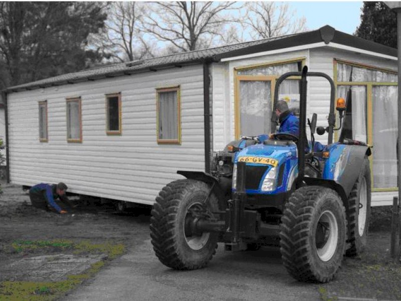 De heren gingen zorgvuldig te werk, uitermate vriendelijk en na een bakkie koffie was het zover, de caravan ging van de dieplader af en werd achter een meegebrachte tractor gekoppeld.